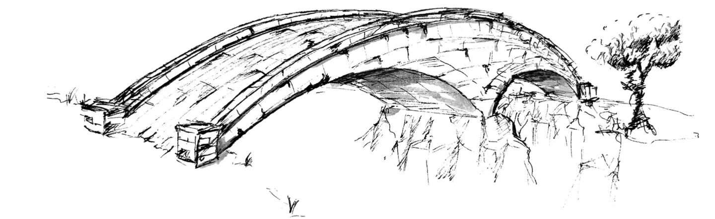 This is a stone arch bridge, done in ink and a little bit of marker. I do all of my perspective freehand, because I try to spend as little time as possible on any sketch, focusing on getting the idea down rather than exactly perfect parallel perspective lines.